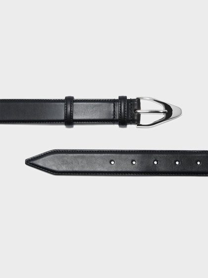 Abel is a smooth leather belt with an A-shaped buckle, designed to be worn around the waist or fit snugly around the hips.