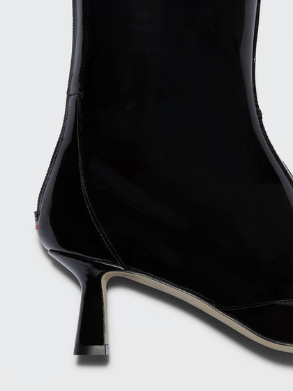 Alexis is our tall, pointed-toe boot defined by a T-Bar detail, crafted from patent leather and finished with layered details that nod to trompe l'oeil techniques.