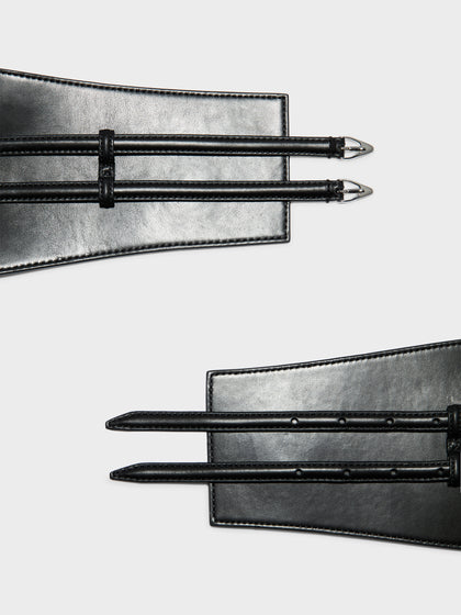 Alyx is a bold corset belt crafted from smooth leather. A wide central panel is accented by slim double straps that wrap around the waist and fasten with A-shaped buckles.