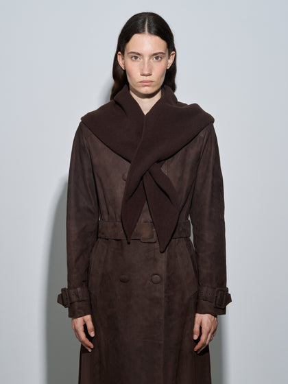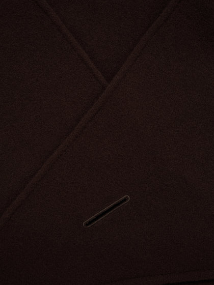 Bri is a triangle scarf with a cape-like design, made from soft wool and finished with a small opening to secure the ends together.