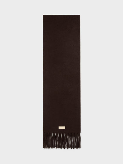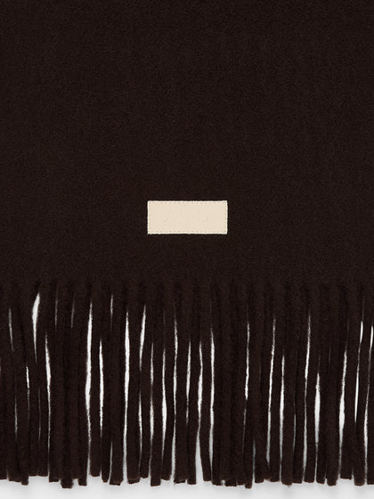 Bria is a chunky wool scarf with long fringe detailing and a brand-embossed leather label.