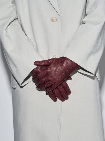 Ginny is a soft leather glove defined by our signature edge—rows of precise crisscross stitching run from fingertip to wrist.