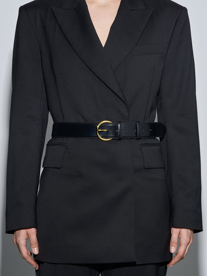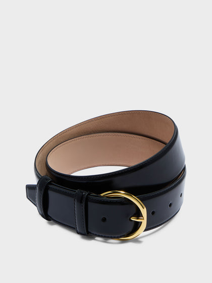 Rene is a thick, understated belt featuring our signature round buckle, crafted from polished calfskin leather with a subtle sheen.